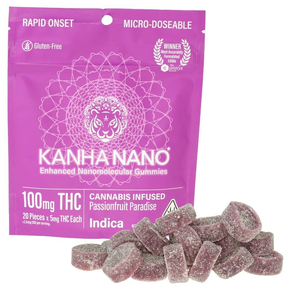Kanha Nano utilizes nanomolecular technology to create the first fast-acting gummies in the industry. We take our award-winning, great-tasting gummies and infuse them with cannabinoid particles smaller than a wavelength of light, which increases the speed and amount that enters into your bloodstream. Our Passionfruit Paradise gummies are divinely sweet and made with indica terpenes, which induce a calm and relaxed state of mind. And with only 5mg of THC per gummy and an average of 10-20 minutes for onset, these are the perfect gummy for micro-dosing